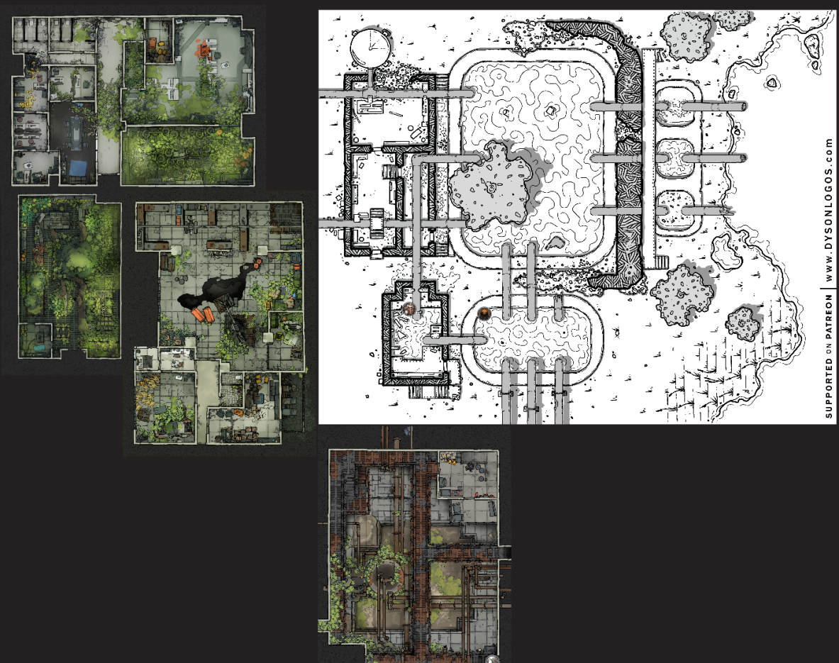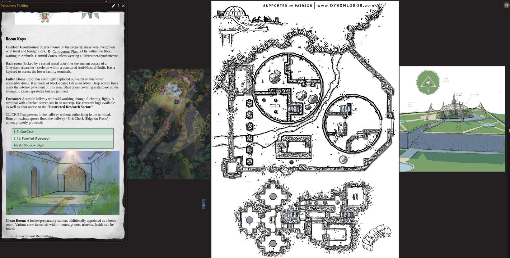 So when the campaign naturally leant towards exploring a derelict Gleysian Research Facility that was dumping mana waste into the Spirits’ Grove, it was time to finally face the fear - building out a proper site with multiple layers (exterior courtyard, interior underground facility, so forth) that could be mechanically explored. I knew I wanted to try out Dyson Logos maps since I’ve seen their work for years and have always been a big fan seeing it with other systems like Shadowdark. I found one that fit well and imported into Questline.